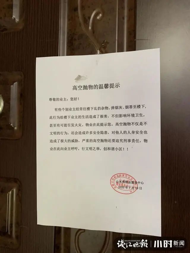 前几天烟蒂抛物的事件发生后,陈军也给21幢楼上每一层都打了电话,但是没有人承认。“都上门当面交谈过,也贴了告示,加强巡逻。”