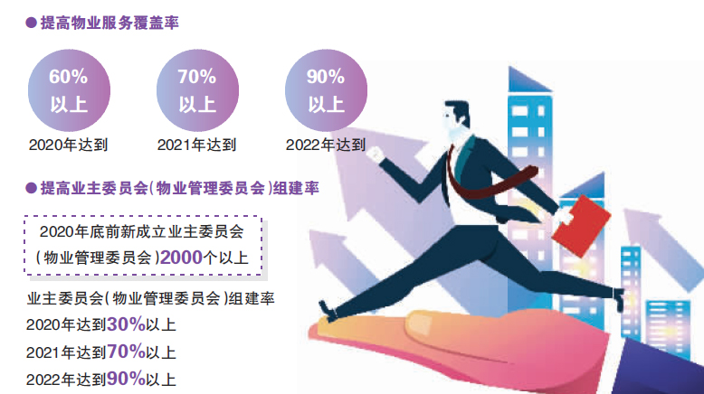 行动计划明确,2020年底前新成立业主委员会(物业管理委员会)2000个以上;业主委员会(物业管理委员会)组建率达到30%以上,2021年和2022年分别达到70%和90%以上。