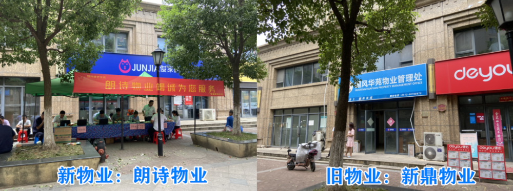 老物业在室内吹空调,新物业在室外露天办公吃盒饭;老物业的保安在传达室内坐着乘凉,新物业的保安只能坐在门外树下值班。