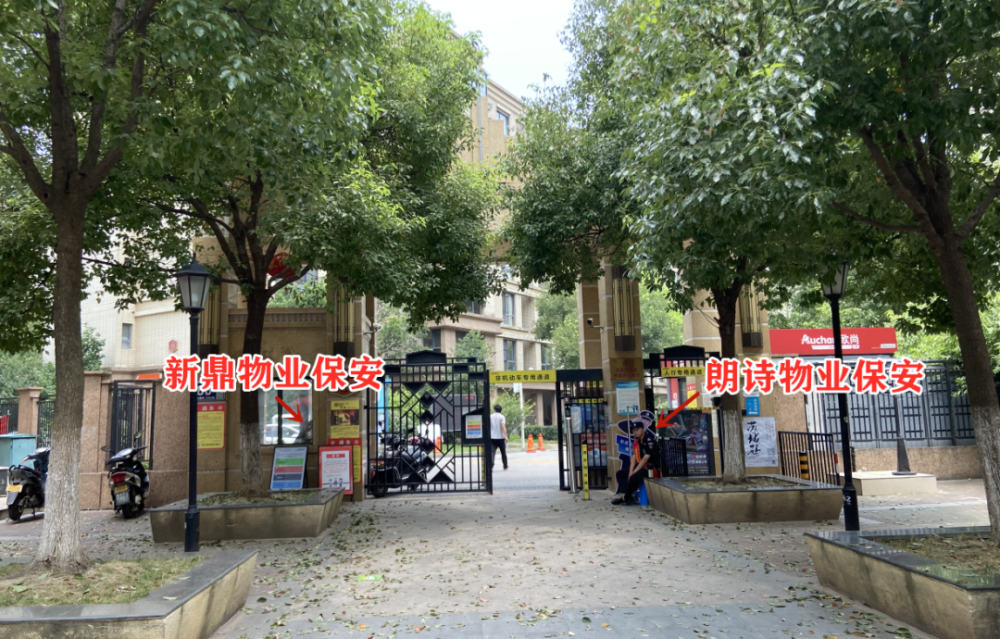 小区大门塑料凳子上坐着朗诗的保安,传达室内坐着新鼎的门卫。朗诗物业工作人员实惨