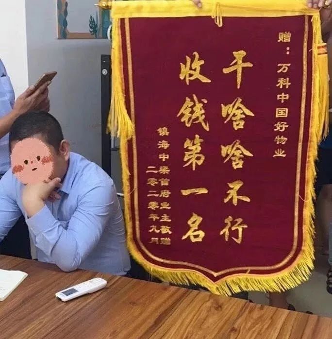 事出原因是,今年8月18日,宁波中梁首府小区的万科物业服务中心针对小区人防车位停车费进行发布,将于9月1日启费的通知并公示收费标准。进入9月份启动收费后,个别业主对物业收费不满意,并开车堵住小区车行出入口,物业干预后,7位业主将印有“干啥啥不行 收钱第一名”的锦旗送到物业服务中心。