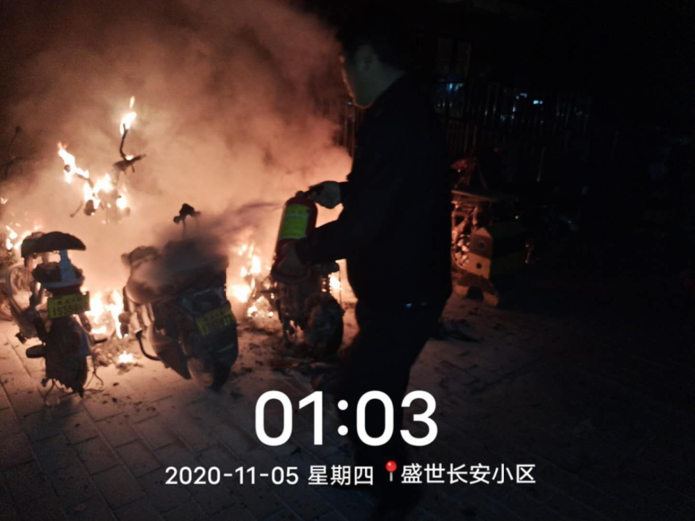 11月5日凌晨1点,位于长安区盛世长安由于业主私自拉电线在楼外给电动车充电,着火后引燃临近5辆电动车也着火,而最快到达火场进行灭火的是物业人员。