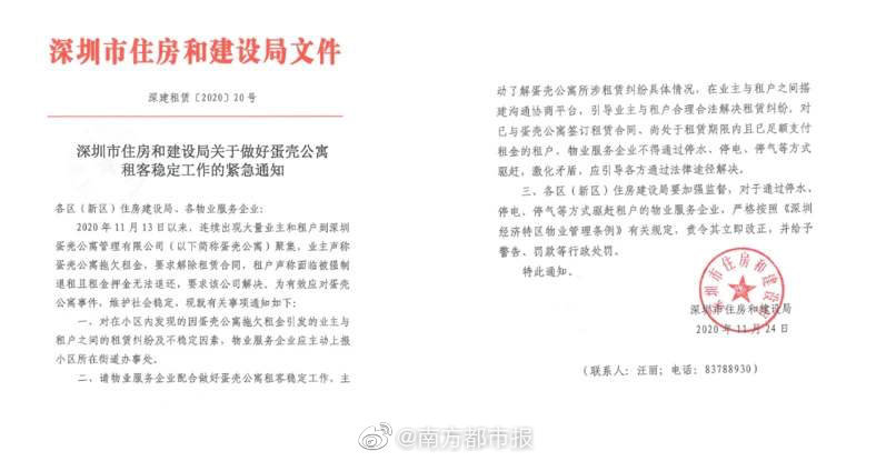 据深圳市物业管理行业协会官网消息,深圳市住建局已于日前下发《深圳市住房和建设局关于做好蛋壳公寓租客稳定工作的紧急通知》(下简称《通知),明确对已与蛋壳公寓签订租赁合同、尚处于租赁期限内且已足额支付租金的租户,物业服务企业不得通过停水、停电、停气等方式驱赶,激化矛盾,应引导各方通过法律途径解决。